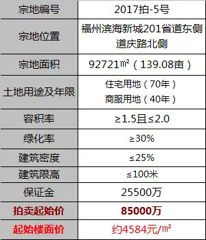 宗地2017拍-5号地块位于福州滨海新城201省道东侧、道庆路北侧,总用地面积92721平方米(139.08亩),土地用途为住宅用地(70年)、商业用地(40年),容积率要求大于等于1.5且小于等于2.0。